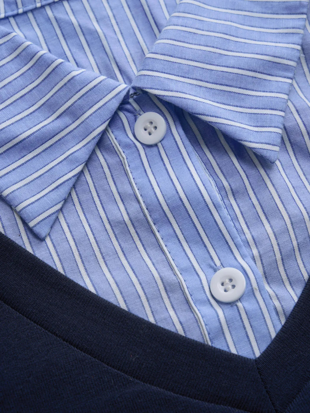 Dieses stilvolle Top kombiniert klassische Eleganz mit modernem Komfort. Die kontrastierenden Kragenstreifen verleihen dem Oberteil einen professionellen, zugleich lässigen Look, perfekt für Büro, Uni oder entspannte Freizeit-Outfits. Gefertigt aus einer weichen Baumwollmischung, bietet das Top atmungsaktiven Tragekomfort und passt sich Ihrer Figur angenehm an. Der V-Ausschnitt sorgt für eine flatternde Silhouette, während die kontrastierenden Kragenstreifen jedem Outfit einen stilvollen Akzent verleihen.